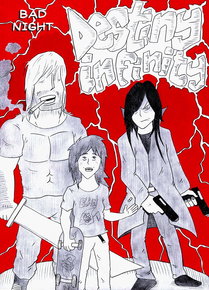 Pendant dix ans, j’y suis retourné à intervalles irréguliers, avançant peu à peu, jusqu’à son aboutissement. Quelques années après, j’ai décidé de tout scanner et de mettre les pages au propre, pour pouvoir les partager avec mon entourage. Vous constaterez donc une évolution au niveau du dessin dans ce premier récit : Destiny Infinity, Tome 0 : Bad Night.